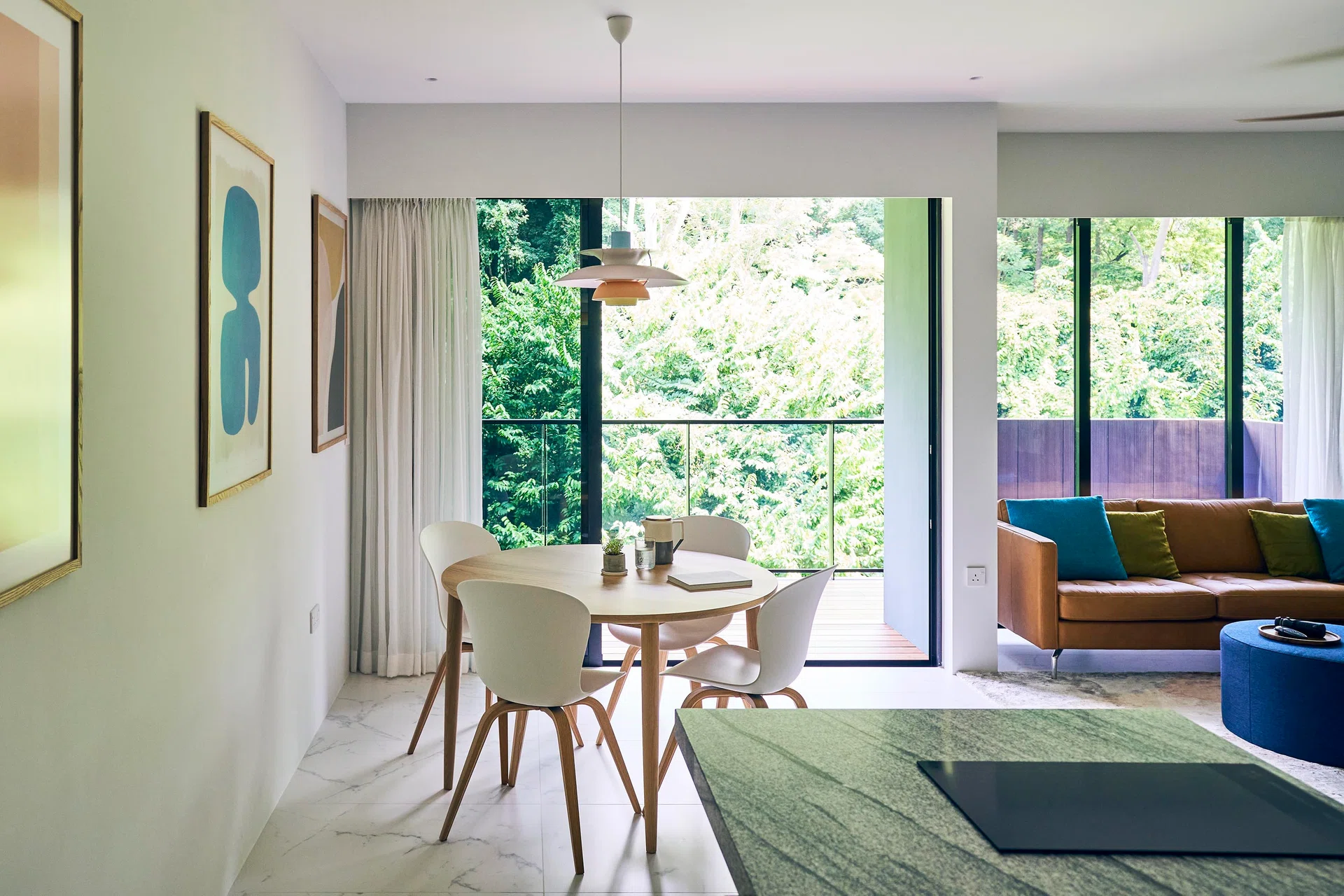 The expanded living and dining areas now open onto the balcony, framed by full-height windows that draw in greenery and light. “The design intent was to create openness and flow while maximising the outdoor connection,” they share. Even the TV placement was reconsidered, positioned along the corridor wall so the living area remains focused on the lush view.