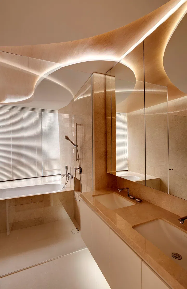 Inspired by the development’s landscape-driven master plan, Ai Tiong carried the concept indoors. Fluidity, sensuous textures, and curving movement became the basis for a space that is immersive and sculptural. The home ultimately unfolds more like a continuous art piece than a conventional condominium.