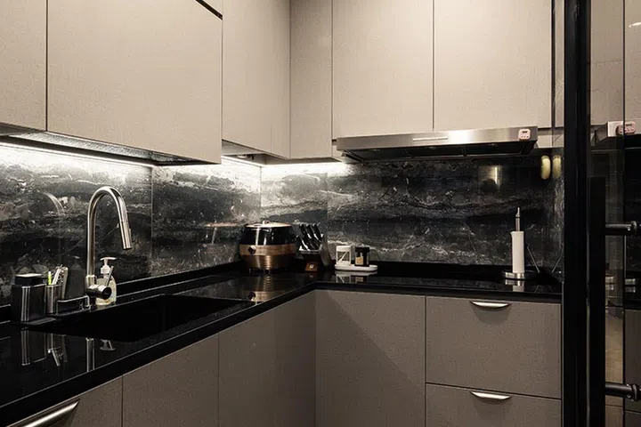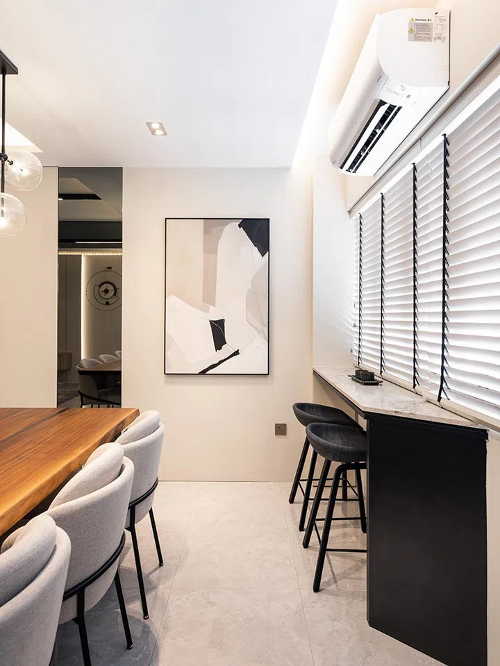 In the dry kitchen, switching to dark-tinted glass panels transformed the area into a bold focal point, while glossy stone tiles on the kitchen island create a stunning centrepiece. M Atelier softened the presence of columns in the dining area with custom half-height drawers below the window, blending storage with design. The compact wet kitchen uses covered storage and a dark monochrome palette, balanced with lighter upper cabinets for a visually spacious feel. The master bathroom boasts a unique corner bathtub, wall-to-wall mirror, and soft sand-toned finishes, creating a serene, airy retreat.