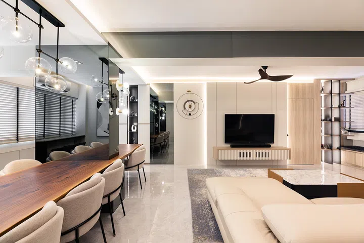 M Atelier transformed this five-room Redhill Lane resale flat into a spacious, open-concept home for a young family and their helper, carefully balancing functionality with aesthetic appeal. Key changes in layout design, such as opening up a bedroom to create a combined dining and study area, and moving the common bathroom entrance to the service yard for added storage, illustrate M Atelier’s thoughtful approach to flow and usability. Cream and wood tones add warmth to the expansive space, creating a cosy, inviting atmosphere that caters to daily family life.