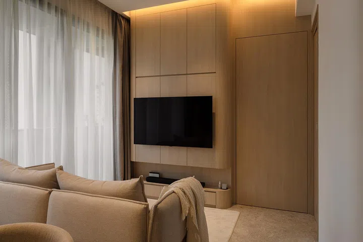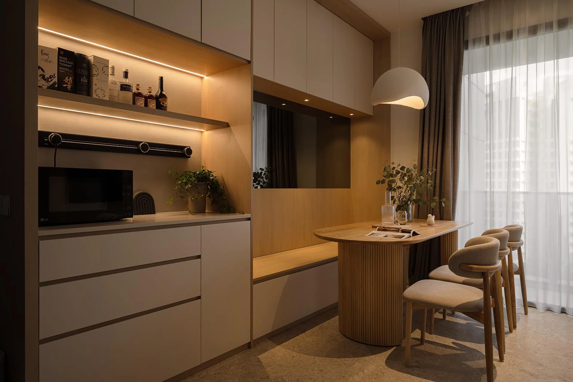 Every detail in this home has been carefully chosen to reflect a calm, understated elegance. In the kitchen, sleek cabinetry and built-in storage maintain a clutter-free environment, while the dining table’s organic shapes and soft upholstery contribute to the cosy, relaxed vibe reminiscent of a stylish cafe. The living area, with its neutral-toned sofa and floor-to-ceiling sheer curtains, invites natural light, creating an airy atmosphere that makes the space feel both welcoming and refined.