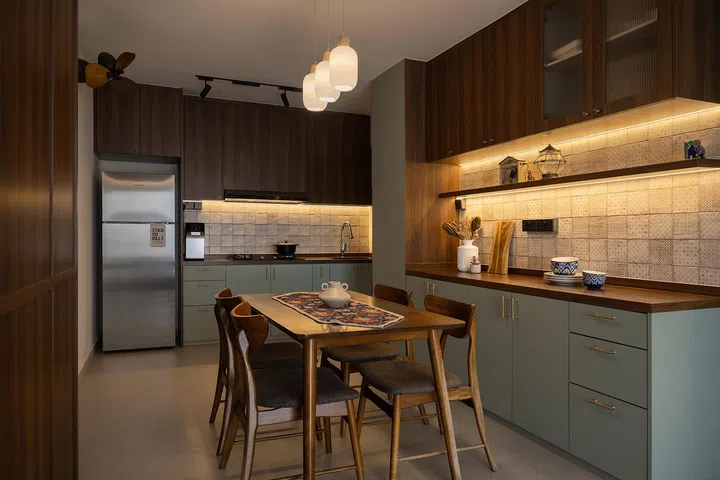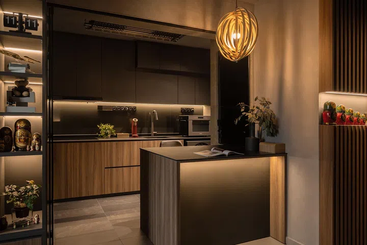 The kitchen and dining areas embody Ovon Design’s skill in balancing aesthetics with practicality. Wood-toned cabinets paired with matte black finishes and under-cabinet lighting add depth and warmth to the dark colour scheme, while the compact kitchen island doubles as a workspace and dining table, ideal for both entertaining and day-to-day functionality.