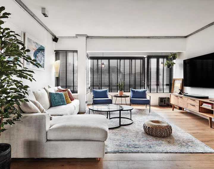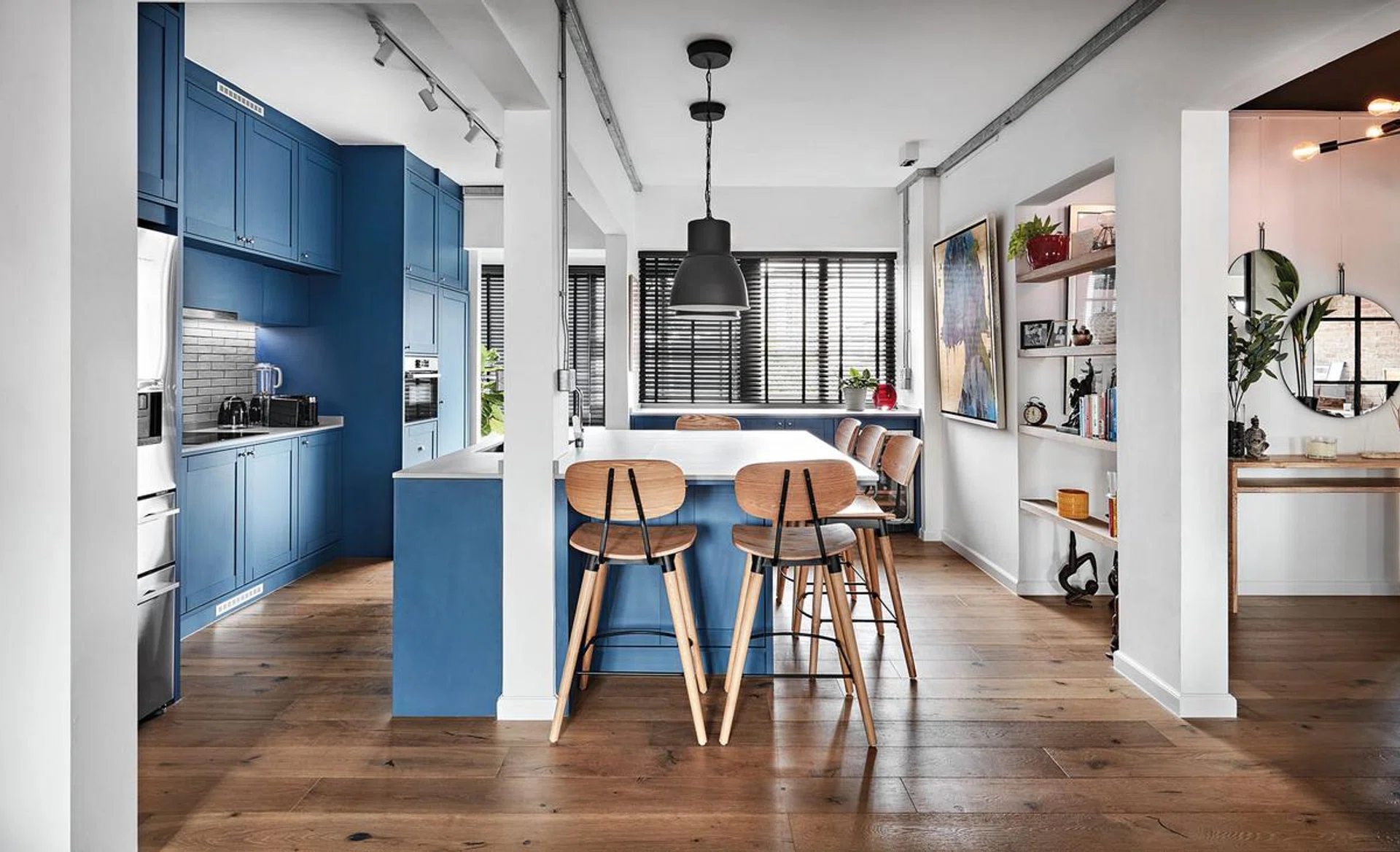 The kitchen and dining area exude a cosy feel with the blue cabinets and customised carpentry. The living area, furnished with a long sofa and white walls, appears bright and spacious.