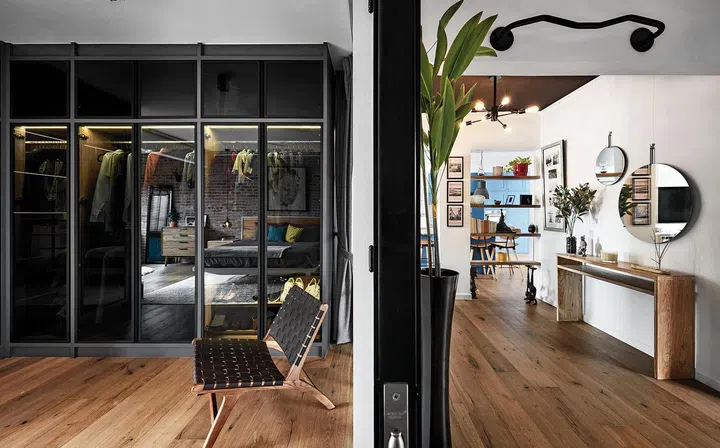 The master bedroom, on the other hand, is enclosed via black-framed glass doors juxtaposing against the earthy brick wall.