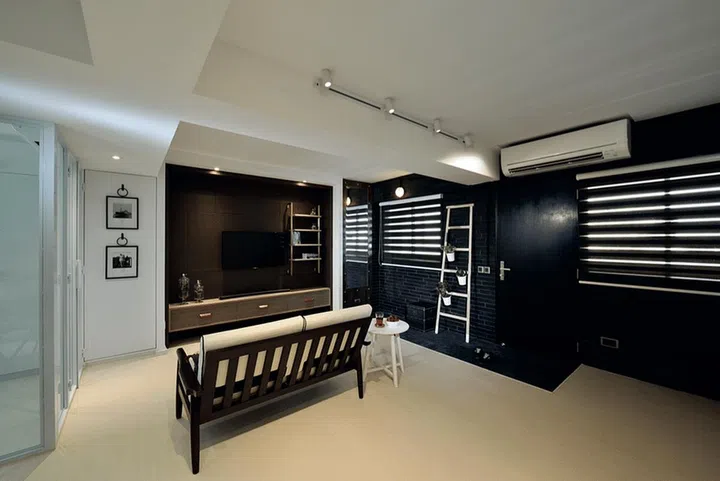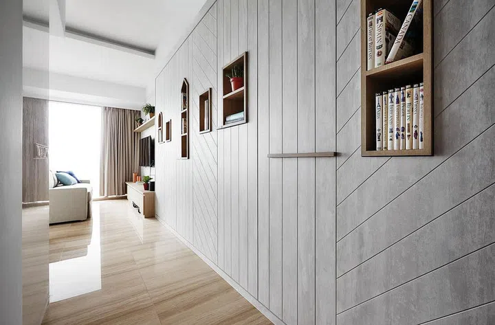 The colour-zoned foyer features a full-height cabinet with a mirror door, and there is a hidden cabinet behind the TV wall, too!