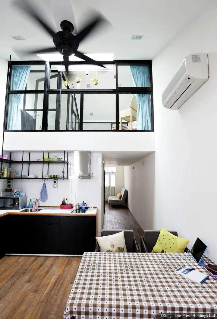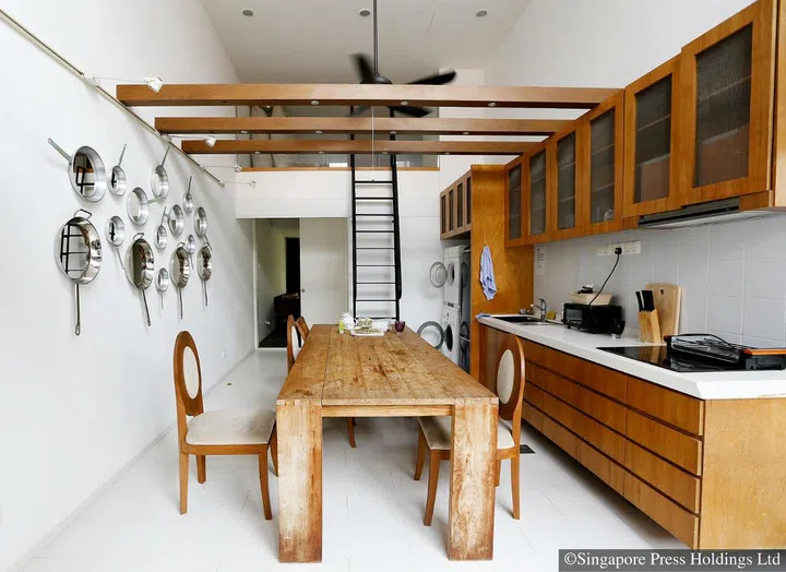 Above: The two communal kitchen/dining areas in a pre-war shophouse on Crane Road, just off Haig Road.