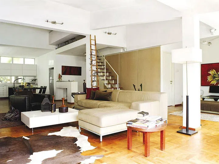 There are various shades of white. This ivory-hued leather sofa goes well with the brighter whites and shades of brown in the room. Design by Aamer Architects.