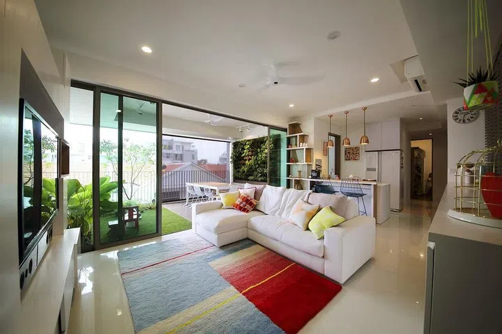Decorate your white sofa with colourful throw pillows, and pair it with a vibrant-hued rug! Design by Space Sense.