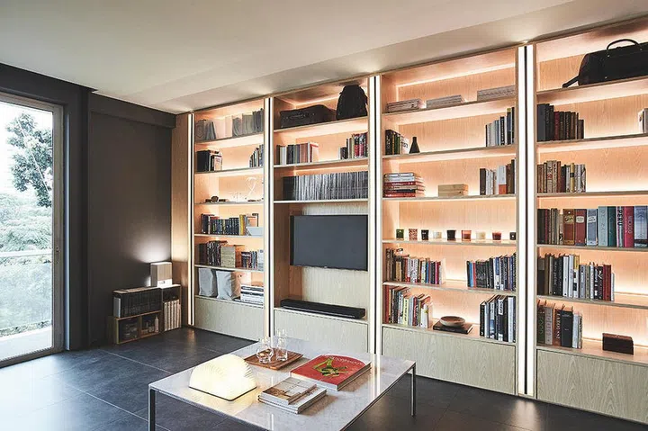 A low-key luxurious look, by Distinct Identity. The dark carpet creates depth in the living room.