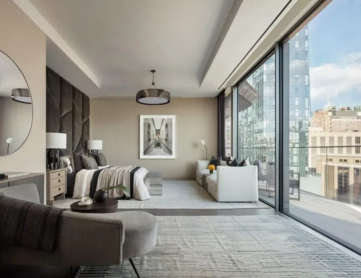 On the first two levels of the penthouse is the kitchen, open-space lounging area, dining room, a library, and five bedrooms -- including this gorgeous, earthy-toned sanctuary.