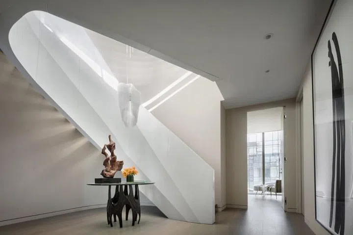 The late Zaha Hadid designed this staircase herself. It leads to the third floor, where the rooftop patio is.