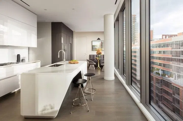 Floor-to-ceiling windows bath the unit in natural sunlight. Zaha Hadid worked with Boffi to design this kitchen.
