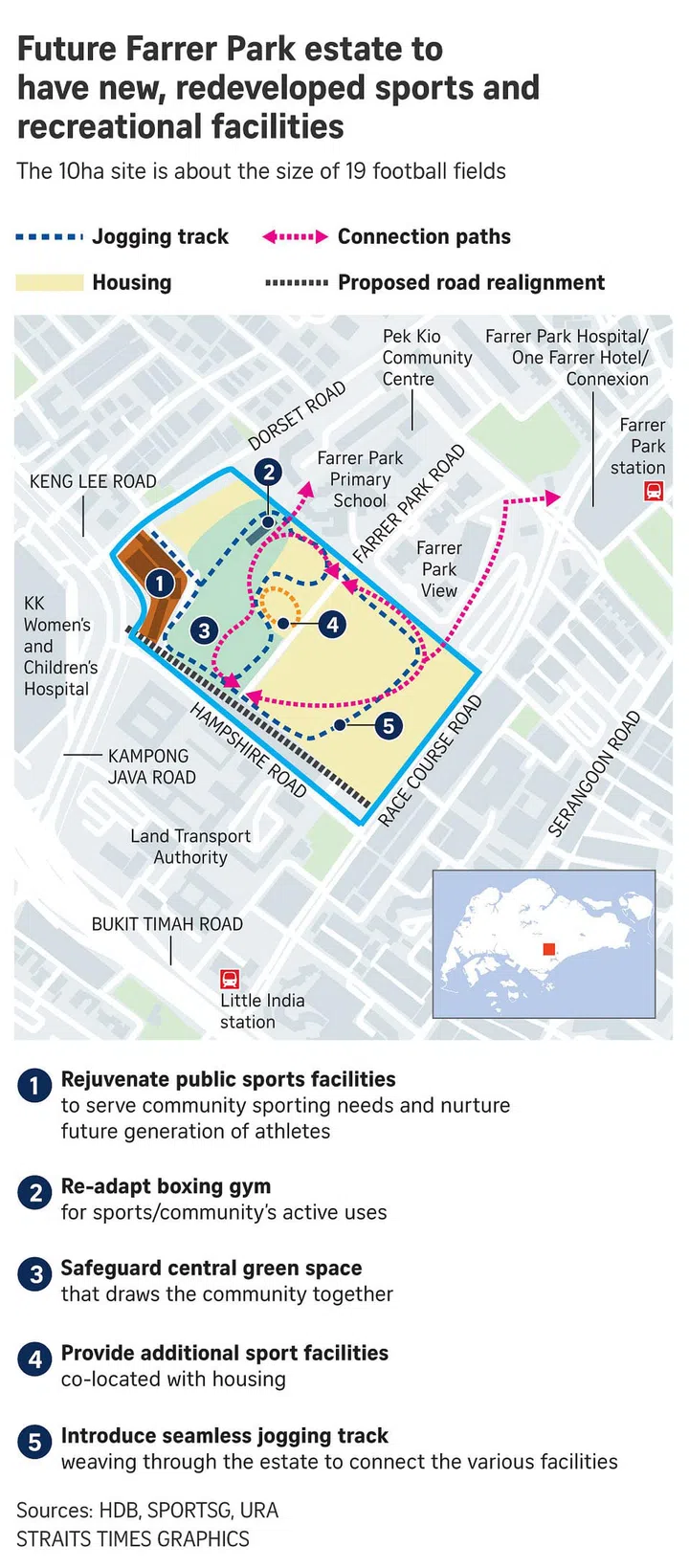 The agencies said they will continue to work with stakeholders to enhance the character and identity of the estate, possibly by weaving in elements of Farrer Park's sporting history into the upcoming sports facilities, as well as through thematic playgrounds and motifs.