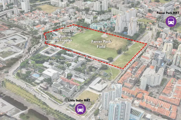 The site, about the size of 19 football fields, is bounded by Dorset Road, Keng Lee Road, Hampshire Road and Race Course Road. It is also near Little India and Farrer Park MRT stations, as well as Tekka Market and KK Women's and Children's Hospital.