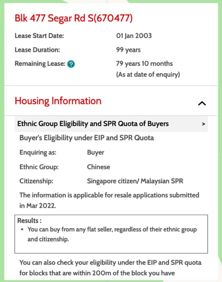 For example, the Queenstown area is known to have a full Chinese quota, so as a Chinese, you won’t be able to buy from any other race but yours. The ethnic quota is based on the block, not the development as a whole so be sure to check for each and every block even though it is very highly correlated.