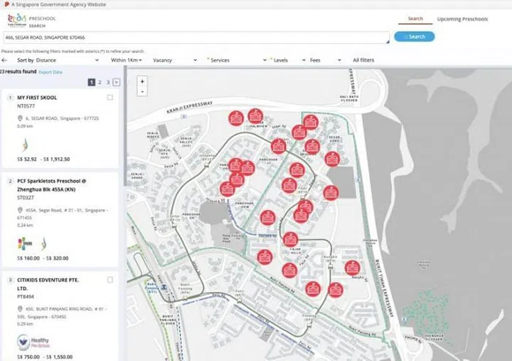 For preschools, you can either refer to ECDA’s website and type in your postal code, or utilise OneMap’s “School Query” function.