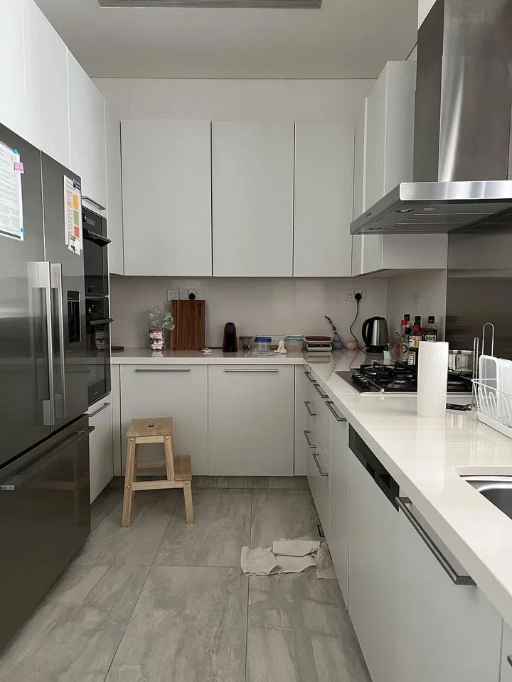 In the shared kitchen, it is fully equipped with built-in appliances like dishwasher, 2-door fridge, microwave, ovens, stove and hood, along with a sink, and plenty of storage space to access the cups and plates.