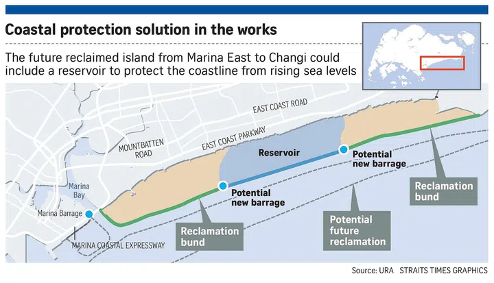 Plans for the "Long Island", a reclaimed island along the south-eastern coast from Marina East to Changi, could include a reservoir to boost Singapore's water supply and protect its coastline from rising sea levels.