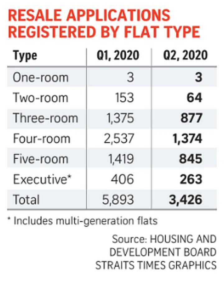 The number of resale transactions fell by 41.9 per cent, from 5,893 flats sold in the first quarter to 3,426 flats in the second, according to data from the HDB yesterday.