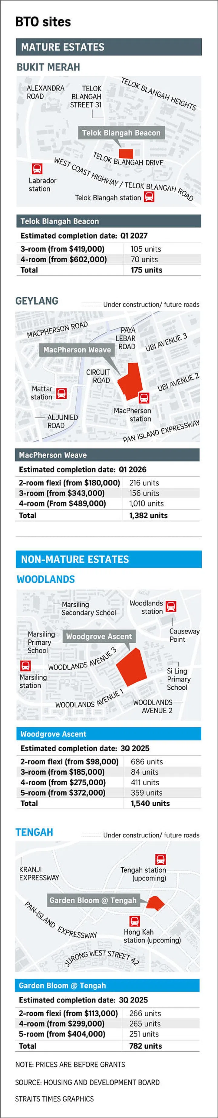 The smallest BTO project is Telok Blangah Beacon in the mature estate of Bukit Merah, where 175 three-room and four-room flats are on offer.