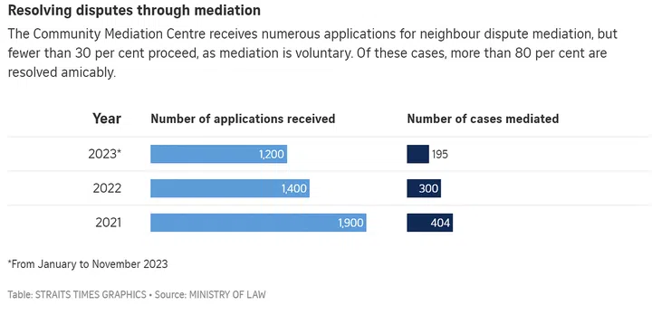 Second Minister for Law Edwin Tong, who spoke on the issue at his ministry’s budget debate in 2023, had said those involved in noise-related disputes could face penalties if they did not attend the mandatory mediation sessions.