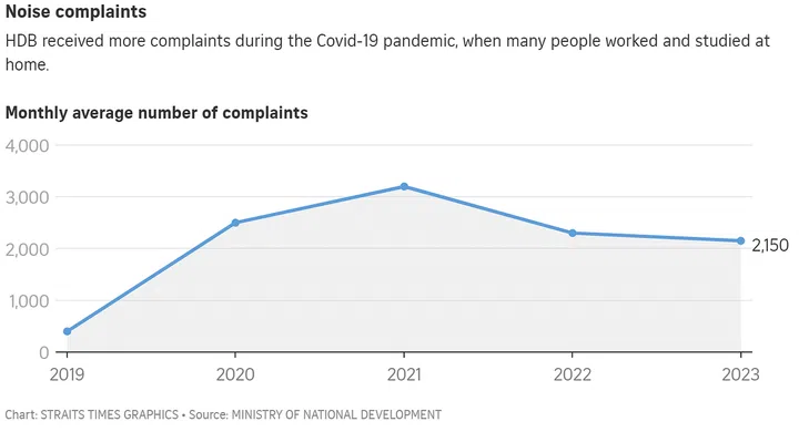 Noise complaints surged during the Covid-19 pandemic, with the Housing Board receiving as many as 2,300 and 3,200 complaints a month in 2022 and 2021 respectively. The number dipped to 2,150 in 2023, but is still significantly higher compared with the monthly average of 400 in 2019.
