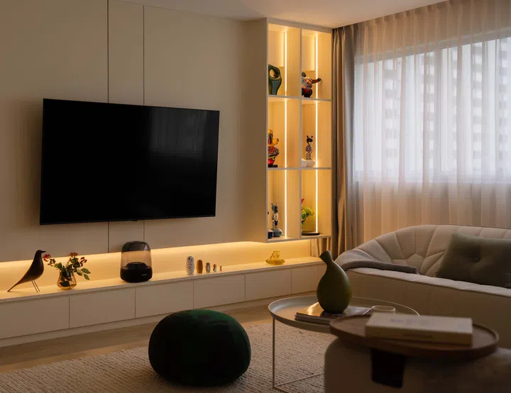 Homeowner Mr Tan recalls his first meeting with Ovon Design senior design consultant, Ng Kah Fei: “I walked in and discovered that we had the same idea back when we first met, so I decided to engage Ovon Design.” Apart from their consensus on a minimalist and cosy design, Mr Tan also shared with Kah Fei his preference for cream and mint green colours and requested for him to match the interior with some soft furnishings that he had already purchased. His brief also included a display cabinet for his collectibles and more storage for his parents’ belongings.