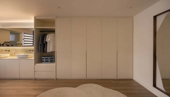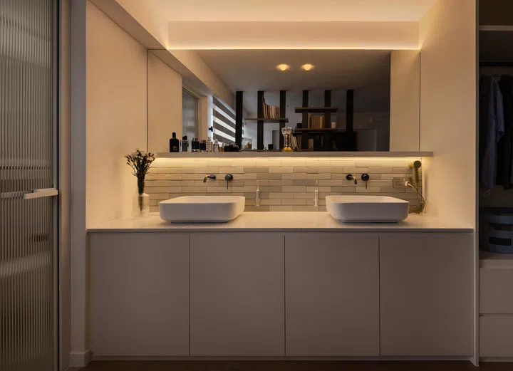 Interior designer Kah Fei confesses that the His and Hers wash basins proved to be the biggest challenge for this project as it was not easy incorporating them within the limited space. However, moving them out of the attached bathroom greatly enhanced the practicality of the space as the basins can be utilised simultaneously, as well as independent of the bathroom enclosure. Concealed wall taps complete the clean and sleek look.