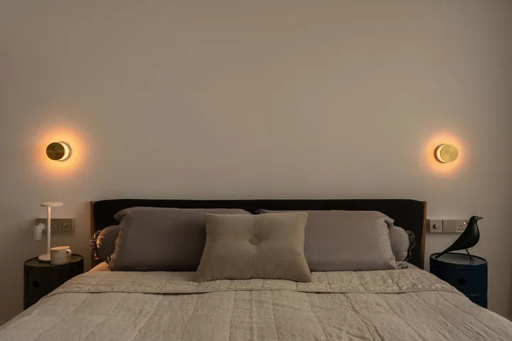 One of the adjacent bedrooms is now the new master bedroom. It has a cosy and restful ambience achieved using wall lights from Sol Luminaire and an interesting wall display that takes the form of an oversized rug.