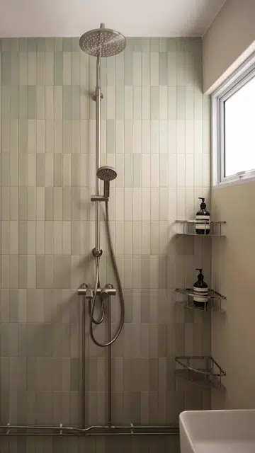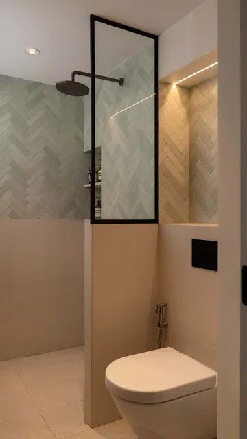 The master bathroom combines large format cream-coloured tiles with more mint green subway tiles to achieve a soothing and cohesive look. A wall-hung water closet and rain shower from Bathworld elevate the experience of typically mundane routines.
