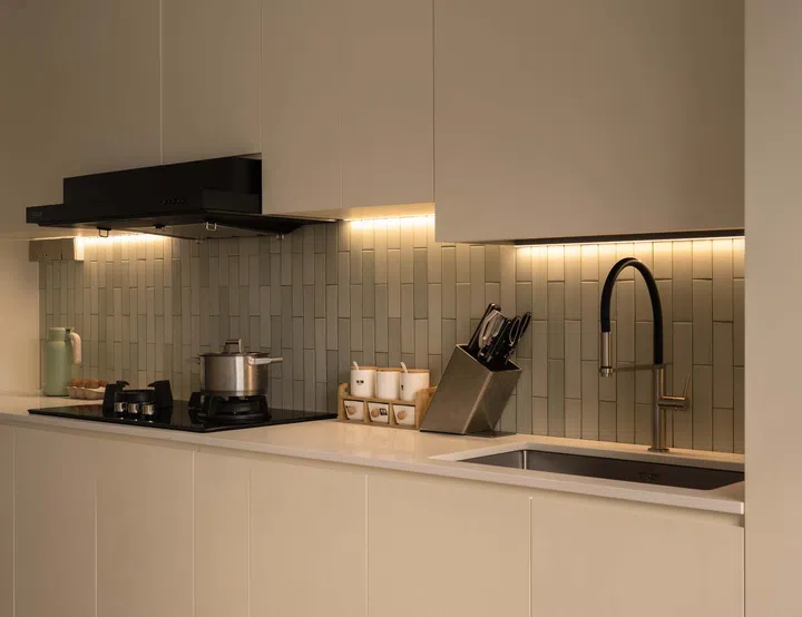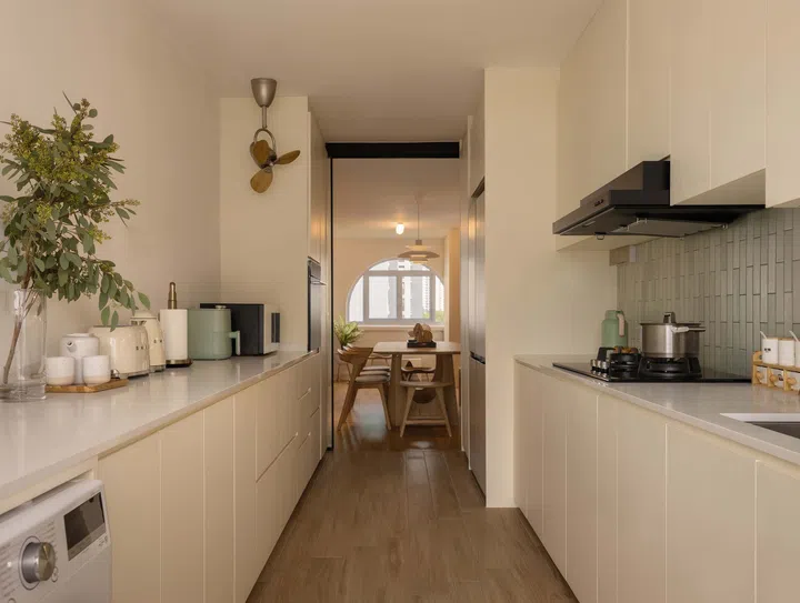 A galley layout maximises the utility of the long and narrow kitchen with ample counter space using a Melmer stone quartz that can withstand heavy duty cooking, along with plenty of storage cabinets.
