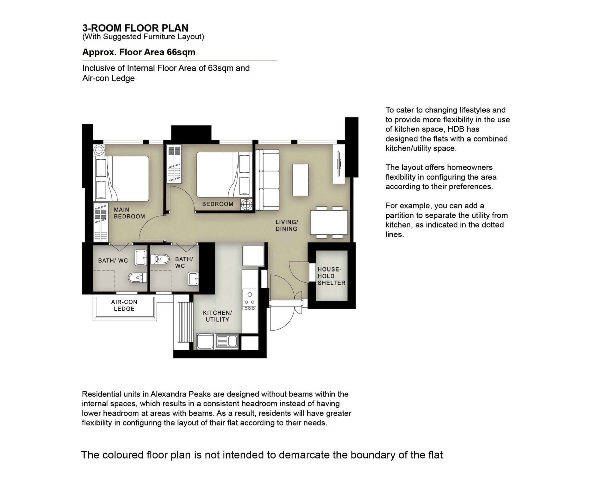 The 3-room flats measure 66 sqm, inclusive of air con ledge. While this looks like a fairly typical layout, the household shelter is located right beside the entrance, creating a narrow hallway opening out into the living/dining area. This isn’t the most space efficient setup, in my opinion. What’s more, the kitchen area is placed in such a way that it cannot be merged with the living/dining area by removing the walls. The kitchen and utility area, however, can be merged or separated with a wall according to the owner’s wishes.