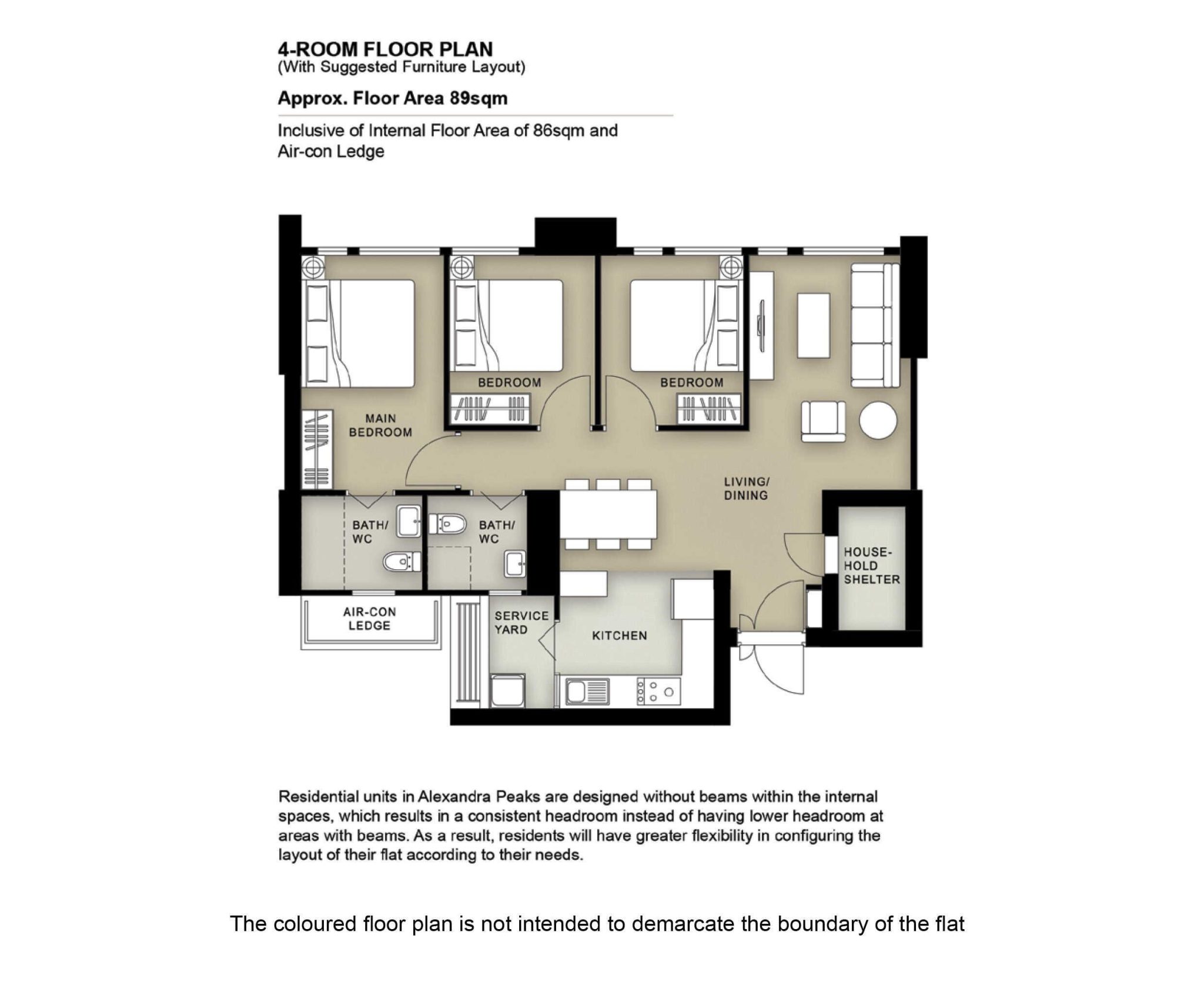 The 4-room flats measure 89 sqm, inclusive of air con ledge. This is a typical layout that lines the three bedrooms up side by side, with an L-shaped living/dining area. Unless the owner decides to erect a partition wall, the kitchen opens up into the living/dining area, allowing for a more spacious feel.