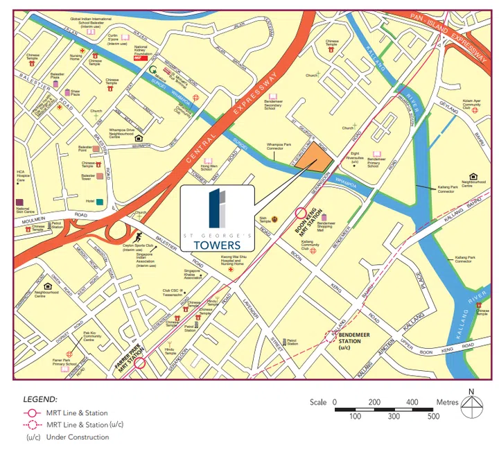 St George’s Towers is located on Saint George’s Lane in the Kallang/Whampoa mature estate, just a four-minute walk from Boon Keng MRT station on the North East Line. Boon Keng is a city fringe location just three stops from the city centre via Dhoby Ghaut, or four stops via Clarke Quay. A second MRT station, Bendemeer on the Downtown Line, is a 17-minute walk away, while Geylang Bahru MRT station, also on the Downtown Line, is an 18-minute walk away.