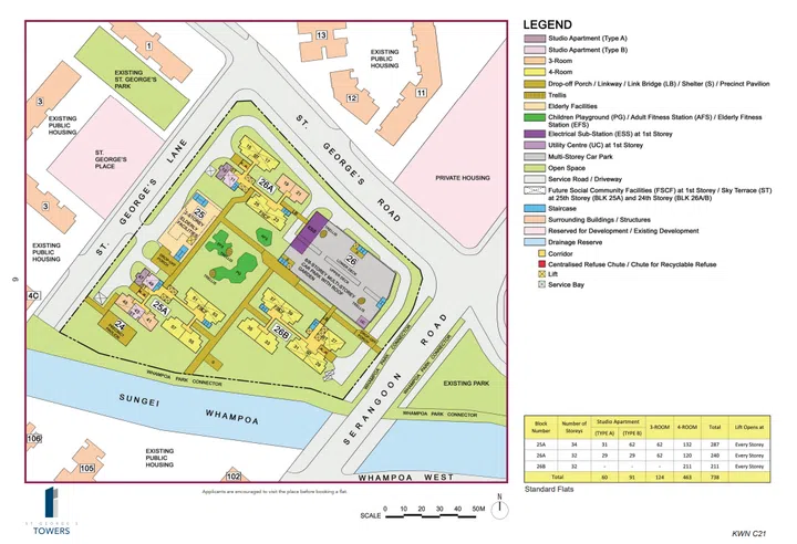 You can find the St George Towers BTO floor plan here. St George Towers consists of Studio Apartments targeted at the elderly, 3-room flats and 4-room flats.