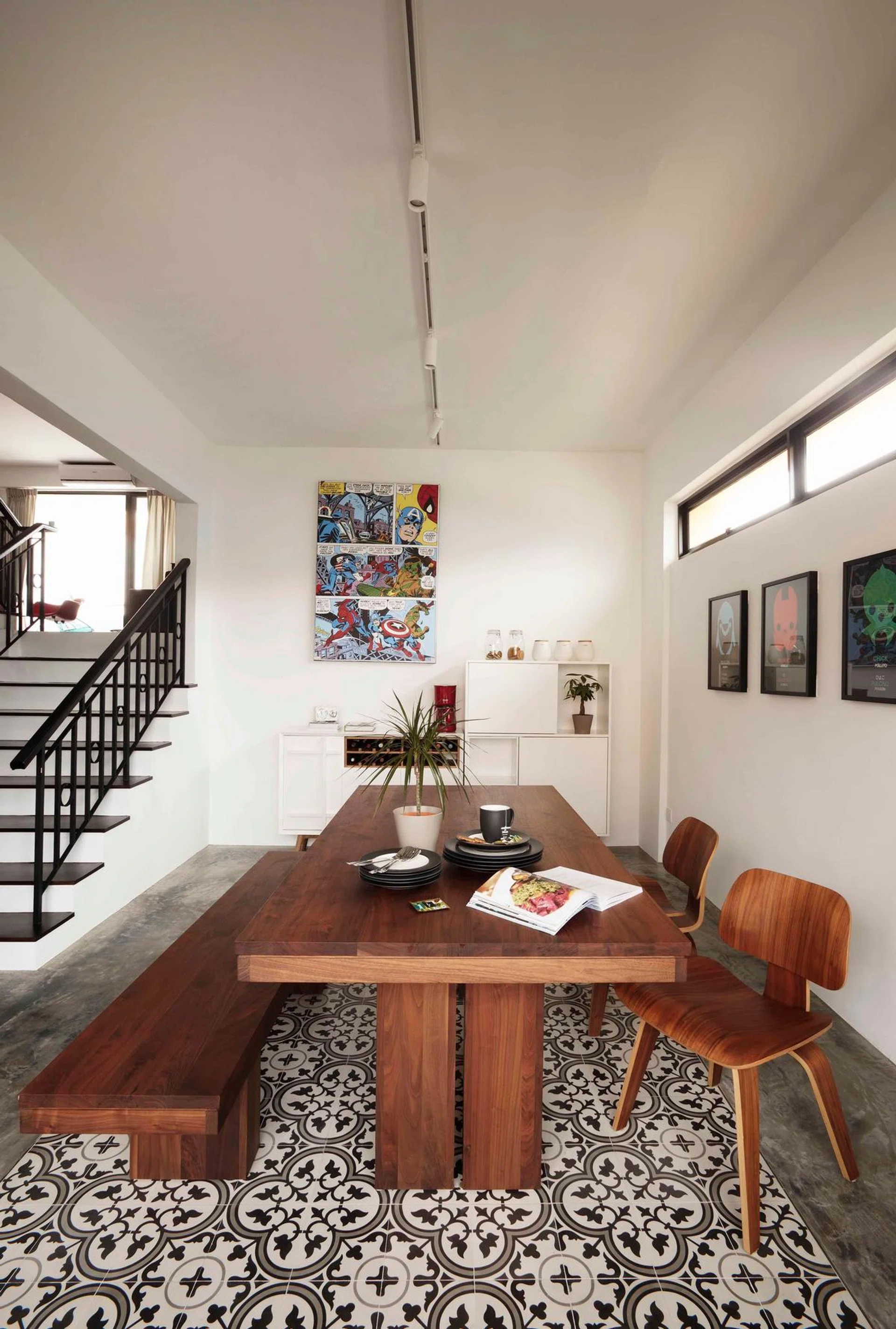 1. Put a tile “rug” in the middle of the concrete flooring
