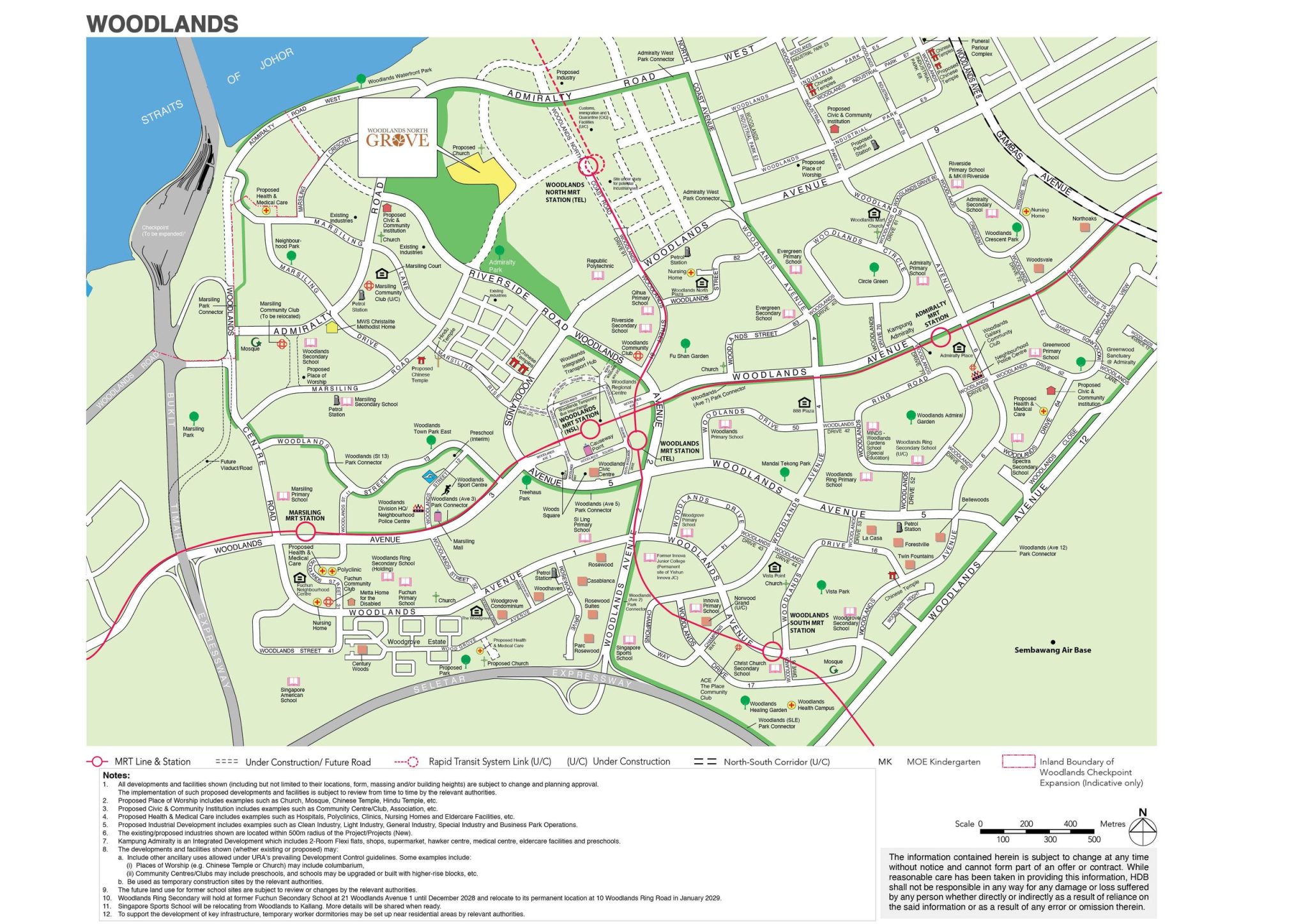Woodlands North Grove is located on Woodlands North Road, in the Woodlands North Coast area and within walking distance of the Straits of Johor and Woodlands Waterfront Park, which offers seaside views. The huge Admiralty Park is also located right next door, and is home to hiking trails and natural habits such as mangrove. This is clearly an attractive location for those who wish to be close to nature and the outdoors.