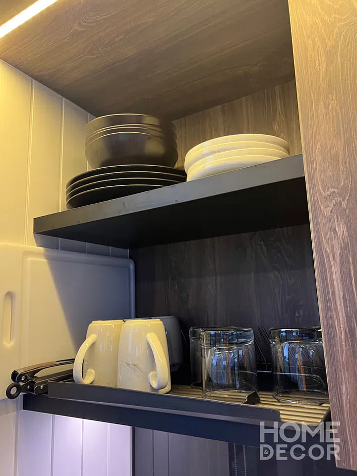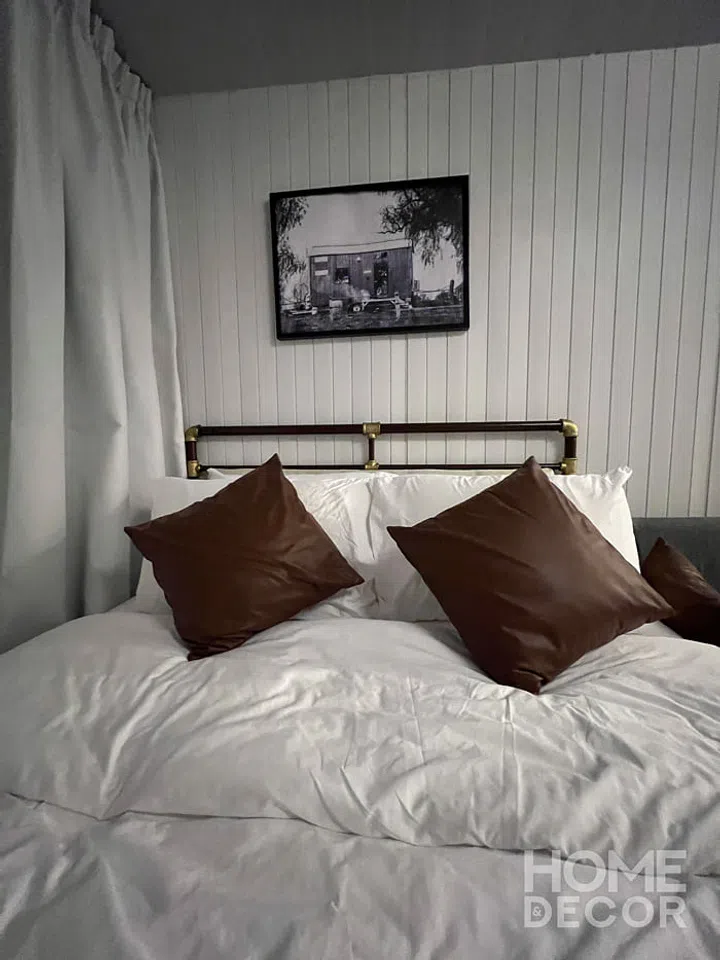Each Tiny House features its unique interior design style, and the Tiny House 1960 is fully decked in a modern industrial theme. The black, brown leather, and dark wood finishing can be seen in the laminates, furniture choice, and decor pieces.