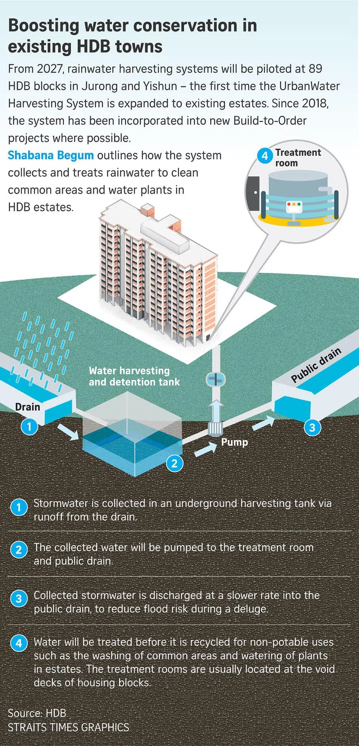 From 2027, more than 80 Housing Board blocks in Jurong and Yishun will be able to conserve more water, with the installation of rainwater harvesting systems at these estates.