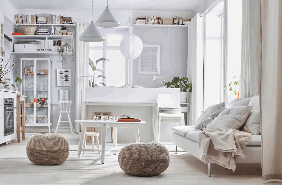 Adding elements of light, sound and automation is as simple as a swipe of a finger on an app or a voice command. Examples are the Tradfri smart lighting collection and the Fyrtur smart blind collection.