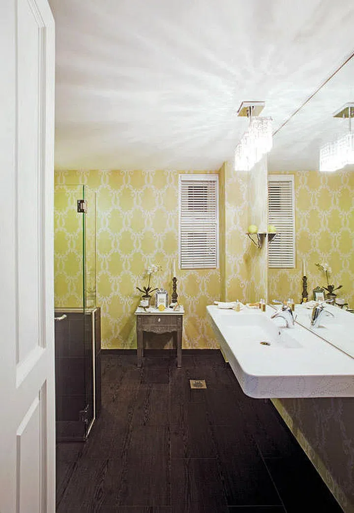 To ensure that every corner of this bathroom receives sufficient light, a chandelier was fixed close to the mirror to double its intensity.
