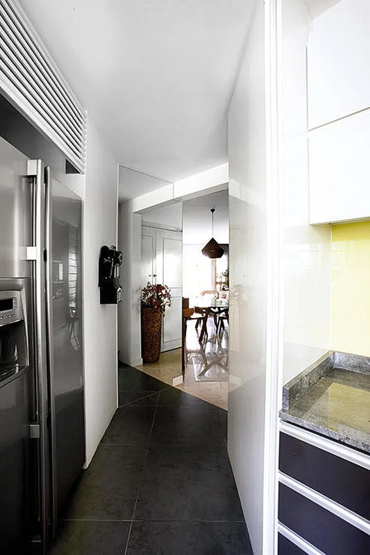 Covering a wall with a floor-to-ceiling mirror creates a convincing illusion of a larger space. The wall at this kitchen’s entrance reflects the entranceway, but looks as if you can walk right through it, doesn’t it?