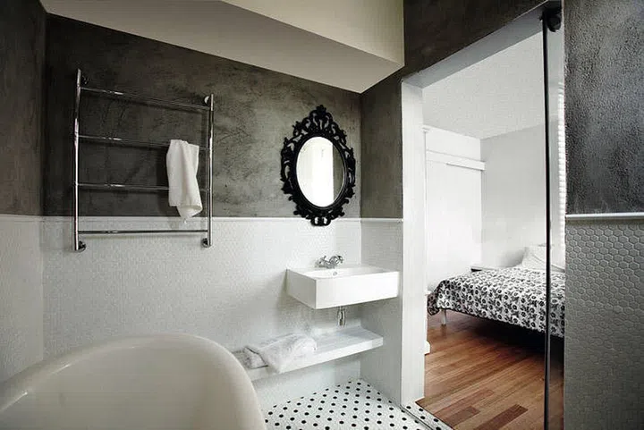 This jet-black Rococo-inspired mirror is not only attention-grabbing, but also accentuates the monochrome bathroom.