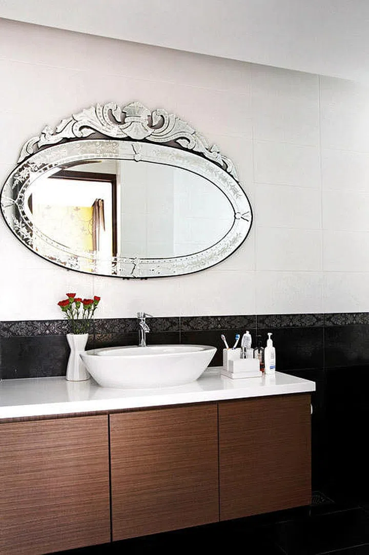 Liven up an understated bathroom with a decorative mirror.
