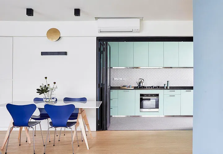 Colour blocking can be seen in the kitchen, which features vibrant colours and textured floor and wall surfaces, such as small hexagonal tiles on the backsplash.