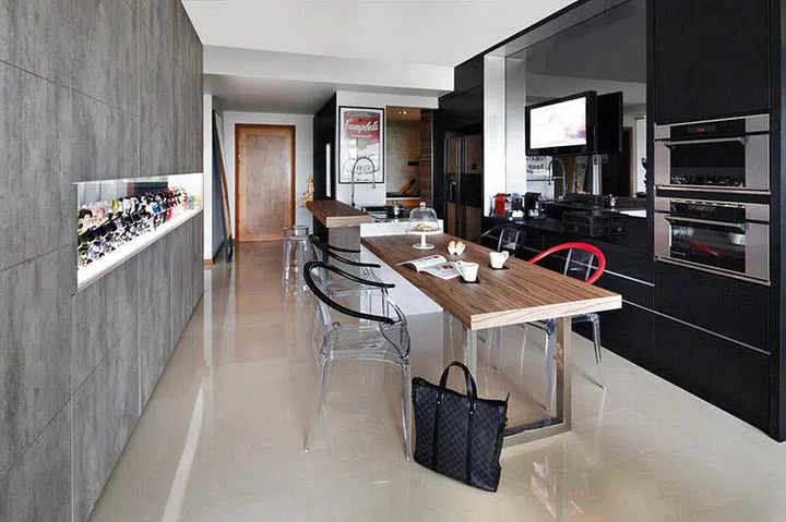 The same wood laminate for the bar counter were used for the dining table to create a uniform look.