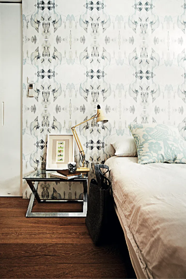 True to a mostly-white palette – minus the parquet flooring, which helps ground the look – an artistic choice of wallpaper lends character to the space.