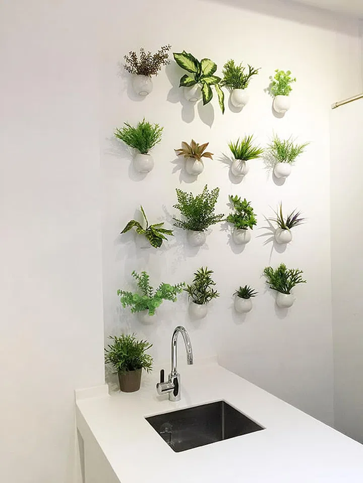 9. If your home has a simple, white theme, complement it with this minimalist version of a green wall. Perfect for a small kitchen!
