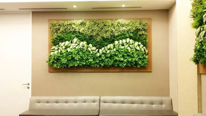 6. Replace hanging artwork with a framed green feature. Because the plants are artificial, you’ll never have to worry about keeping them alive!