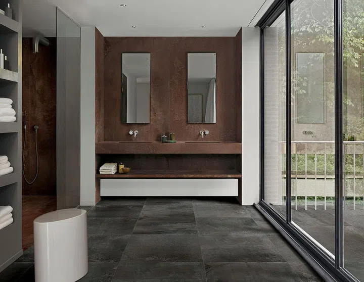 Embrace the Aged Metal Look: Introducing weathered metal finishes into spaces brings it a gorgeous lived-in quality. You can do that in the bathroom now with the Floor Gres Flowtech tiles. Available in russet, and burnished or aged bronze, these tiles provide rich visual texture that contrasts beautifully with matte white surfaces. Available at Rice Fields.